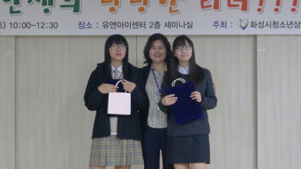 내용 - 캠프 우수소감문 시상(비봉고 2학년 강호정, 화성동화중 1학년 이은설)