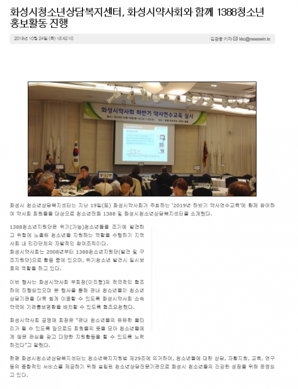 목록 화성시청소년상담복지센터, 화서시약사회와 함께 1388청소년 홍보활동 진행 -Win뉴스- 작성자 관리자 작성일 19-10-30 20:22 | 조회 610 | 댓글 0 본문 http://www.newswin.kr/news/articleView.html?idxno=29895 이전글다음글 댓글목록 0 등록된 댓글이 없습니다. 목록